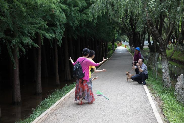 7月21日,游客在滇池東岸撈魚河濕地公園留影。 云南省昆明市撈魚河濕地公園位于滇池東岸。近年來(lái),通過(guò)當(dāng)?shù)卣母脑旌椭卫恚瑩启~河濕地公園整體環(huán)境得到明顯改善。 新華社記者 金立旺 攝