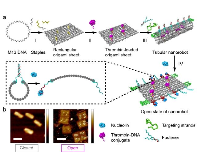 該團(tuán)隊(duì)的丁寶全研究員通過(guò)精準(zhǔn)控制,將一種包含7000多個(gè)堿基的噬菌體的DNA單鏈分子折成長(zhǎng)方形板,放上四個(gè)“殺手”——凝血酶分子,然后再將其卷起來(lái),接口處安裝用核仁素DNA片段做的“鎖”,最終形成90納米長(zhǎng)、直徑為19納米的管狀機(jī)器人。