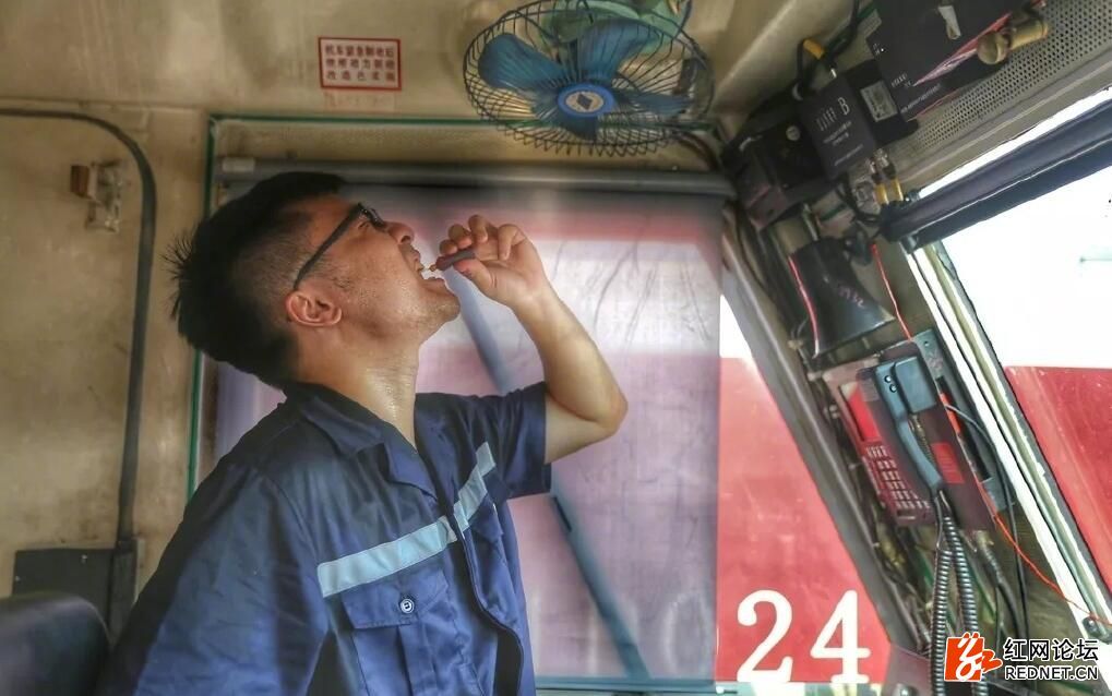 庫(kù)內(nèi)的機(jī)車車廂如同“蒸桑拿”,登車作業(yè)前,都會(huì)喝一支藿香正氣液,提前做好防暑工作。