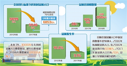 在以習近平同志為核心的黨中央堅強領導下,脫貧攻堅力度之大、規(guī)模之廣、影響之深前所未有。經(jīng)過幾年的努力,脫貧攻堅取得決定性進展:全國現(xiàn)行標準下的農(nóng)村貧困人口由2012年底的9899萬人,減少到2017年底的3046萬人,5年累計脫貧6853萬人,減貧幅度達到70%左右。貧困發(fā)生率由2012年底的10.2%下降到2017年底的3.1%。貧困縣數(shù)量實現(xiàn)了首次減少,2016年有28個貧困縣脫貧摘帽,2017年有125個貧困縣申請摘帽,今年計劃200多個縣摘帽,解決區(qū)域性整體貧困邁出堅實步伐。貧困地區(qū)群眾生產(chǎn)生活條件明顯改善,貧困群眾收入水平明顯提高、獲得感明顯增強。