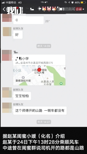 小李還于24日16時(shí)左右于永嘉上塘派出所報(bào)案,其間警方通過(guò)趙某朋友的手機(jī)與滴滴平臺(tái)溝通要求獲得司機(jī)具體信息(電話、車牌等),但無(wú)果。上塘派出所民警證實(shí),昨天派出所內(nèi)有民警參與處理該起事件。