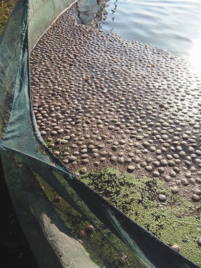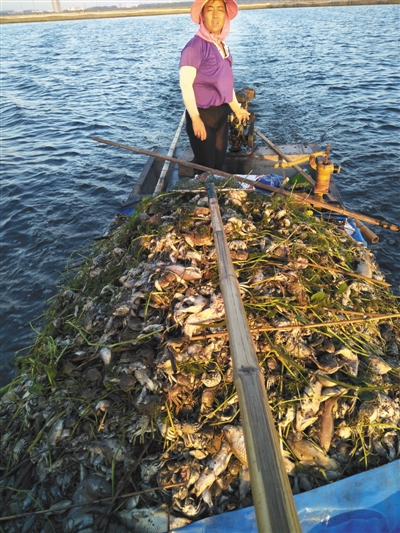第二天,段廣玉發(fā)現(xiàn),大閘蟹也開始大量死亡,并浮出水面?!按箝l蟹死了之后,先沉下去,再浮上來,所以晚了一天?!睆?6日到28日,不斷有死螃蟹浮出水面,段廣玉總共撈了五六船大閘蟹。“全都死光了,沒浮上來的也爛在湖里了,數(shù)量無法計算?!?/p>