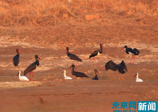 河南省孟津縣黃河濕地國家級自然保護區(qū)內(nèi)的黑鸛(黃河濕地孟津管理局供圖)