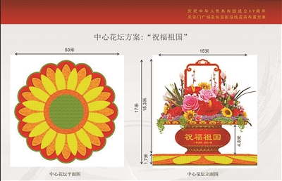 巨型花籃的北側(cè)是玻璃鋼制成的紅色籃體。今天凌晨,兩輛130噸吊車駛?cè)胩彀查T廣場,把花盤緩緩吊裝到籃體上。北京市花木有限公司相關(guān)負(fù)責(zé)人介紹,吊裝過程是有一定難度的,因為花盤體量大、分量重,要想平穩(wěn)、安全地吊裝到籃體上,需要精準(zhǔn)把握平衡。“正常情況下,要花費一個小時左右才能完成。”吊裝完成后,整個花壇頂高17米,花壇底部直徑50米?;@體南側(cè)書寫“祝福祖國,1949—2018”,籃體北側(cè)書寫“歡度國慶,1949—2018”。