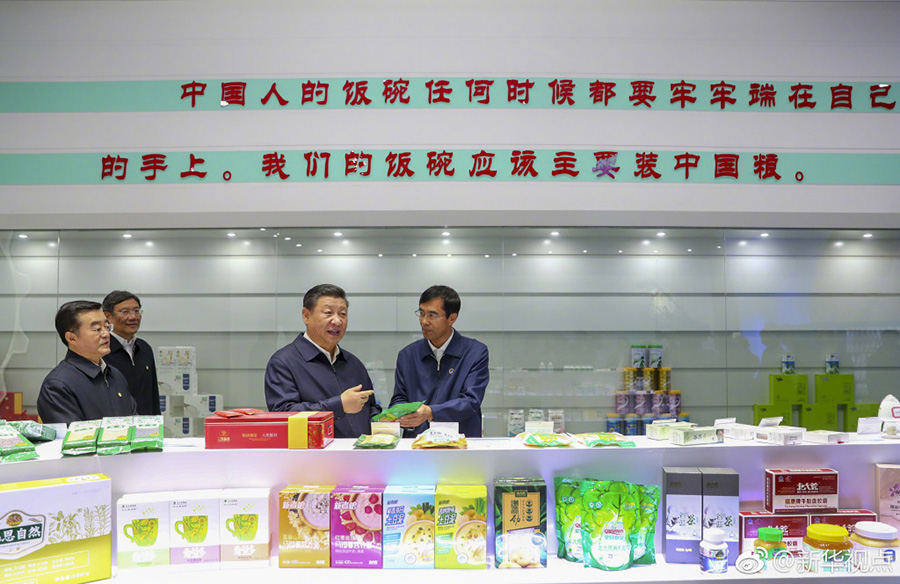 25日下午,首個“中國農民豐收節(jié)”剛過,習近平就深入三江平原腹地黑龍江農墾建三江管理局,考察糧食生產和收獲情況。他邊聽介紹,邊向農場負責人詢問今年收成如何、有沒有病蟲害、能否做到連年豐收,并強調中國人的飯碗任何時候都要牢牢端在自己的手上。在北大荒精準農業(yè)農機中心一樓大廳,當地出產的米油豆奶等各類農產品擺滿展臺。習近平走近前去,雙手捧起一碗大米,意味深長地說:“中國糧食,中國飯碗?!保ㄎ淖郑簭垥运?攝影:謝環(huán)馳)