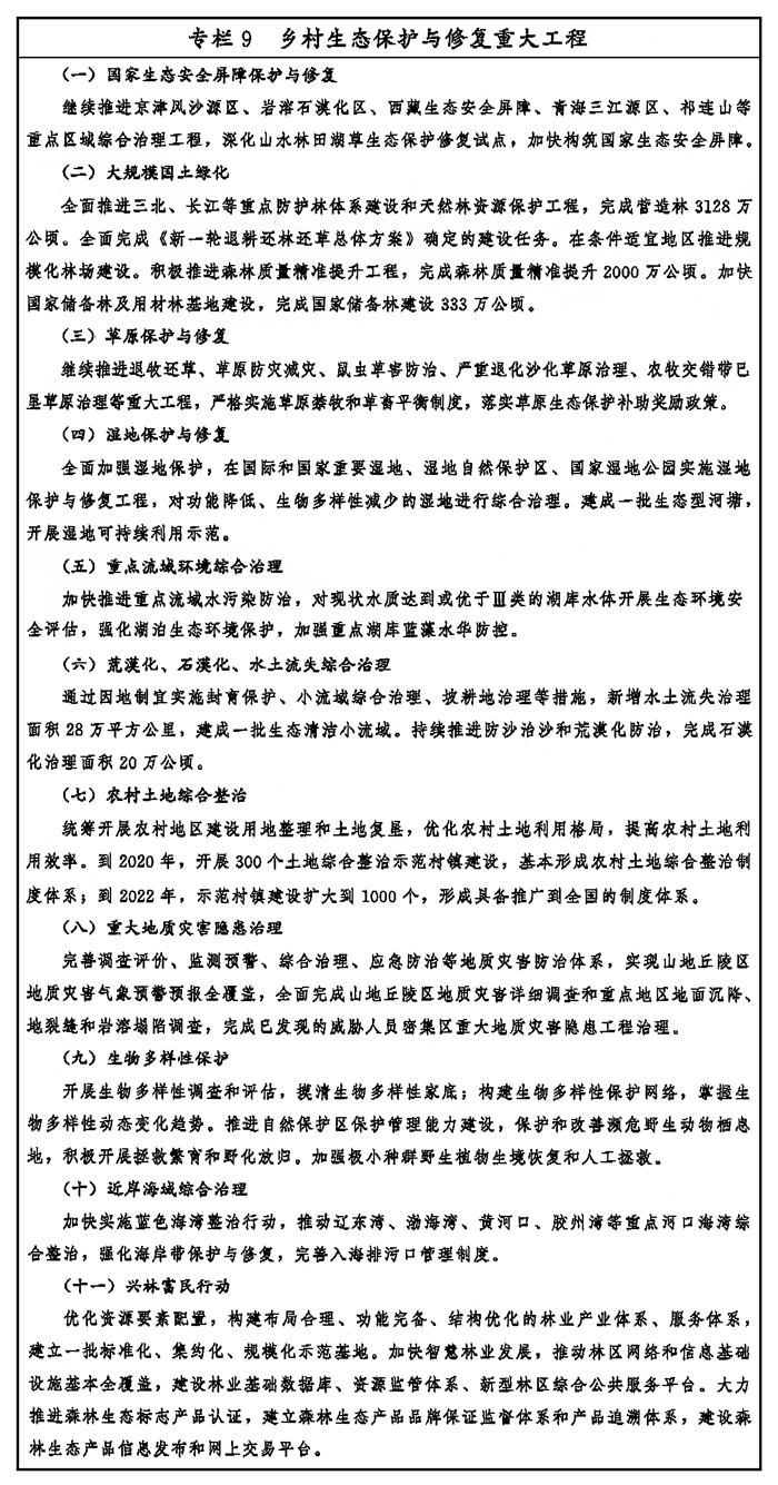 大力實(shí)施鄉(xiāng)村生態(tài)保護(hù)與修復(fù)重大工程,完善重要生態(tài)系統(tǒng)保護(hù)制度,促進(jìn)鄉(xiāng)村生產(chǎn)生活環(huán)境穩(wěn)步改善,自然生態(tài)系統(tǒng)功能和穩(wěn)定性全面提升,生態(tài)產(chǎn)品供給能力進(jìn)一步增強(qiáng)。