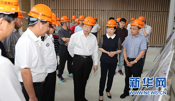 浙江省湖州市委副書記、市長錢三雄(前右三)檢查位于德清縣的首屆聯(lián)合國世界地理信息大會項目建設(shè)(2018年6月10日攝)。新華社發(fā)