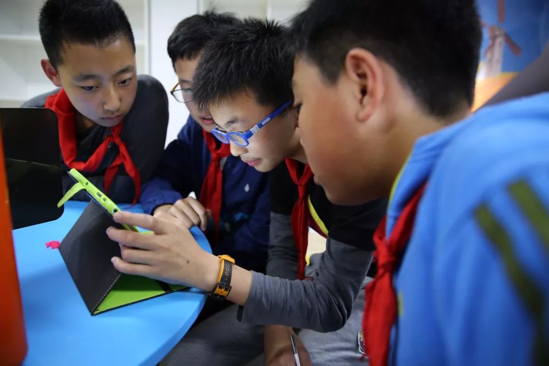 幾位小學(xué)生正在用平板電腦設(shè)計作品