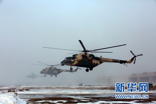 2018年1月5日,新疆軍區(qū)某陸航旅運(yùn)輸直升機(jī)一營(yíng)在嚴(yán)寒條件下組織飛行訓(xùn)練。 新華社發(fā)(吳世科 攝)