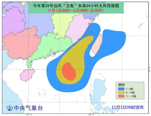 受“玉兔”和冷空氣共同影響,11月 1日08時(shí)到11月2日08時(shí),廣東東部、福建中南部沿海、臺(tái)灣東部和南部等地將有大雨,局地有暴雨或大暴雨(50~110毫米)。東海南部偏南海域、臺(tái)灣以東洋面、巴士海峽、南海中東部偏北海域和南海西北部偏東海域及臺(tái)灣沿海將有7~8級(jí)大風(fēng),陣風(fēng)9~10級(jí);臺(tái)灣海峽、福建沿海、廣東東部沿海、南海東北部大部海域風(fēng)力達(dá)9~10級(jí),陣風(fēng)11~12級(jí);“玉兔”中心經(jīng)過的南海東北部的部分海域或地區(qū)的風(fēng)力可達(dá)11~12級(jí),陣風(fēng)13~14級(jí)(見圖2)。