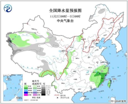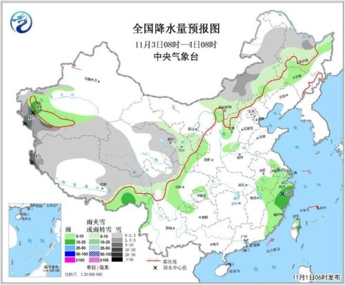11月2日08時(shí)至3日08時(shí),內(nèi)蒙古東北部、新疆東部和南部、西藏西北部、青海西部、甘肅西北部和河西等地部分地區(qū)有小到中雪或雨夾雪,其中,南疆西部山區(qū)等地局地有大雪或暴雪(10~12毫米)。江西東北部、浙江南部、福建北部和中東部、廣東東部和臺(tái)灣島等地部分地區(qū)有中到大雨,其中,臺(tái)灣島東北部局地有暴雨或大暴雨(100~120毫米)。新疆東部和北部、內(nèi)蒙古西部、甘肅河西等地部分地區(qū)有5~6級(jí)及以上風(fēng)(見圖4)。臺(tái)灣海峽、南海東北部海域?qū)⒂?~9級(jí)、陣風(fēng)10~11級(jí)的大風(fēng)。