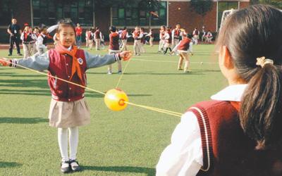 武漢市紅領(lǐng)巾學(xué)校學(xué)生在操場上分組玩“穿梭拉拉球”游戲。本報記者 田豆豆攝