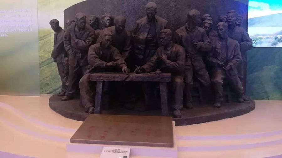 “我們的家鄉(xiāng),在希望的田野上?!?978年冬,安徽鳳陽縣小崗村18位農(nóng)民堅定地按下紅手印,實施包產(chǎn)到戶,拉開了中國農(nóng)村改革的大幕,成為中國改革的標(biāo)志。這座雕塑讓我們重溫那個永載歷史的瞬間。