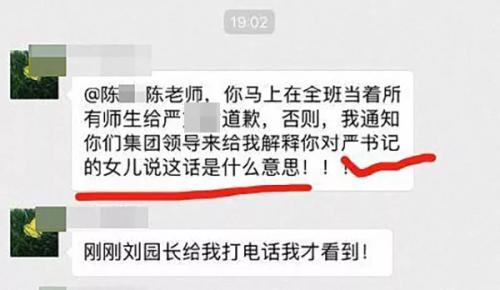 隨后,群內(nèi)署名為“嚴(yán)某某媽媽”的人士發(fā)言稱,“陳老師,你馬上在全班當(dāng)著所有師生給嚴(yán)某某道歉,否則,我通知你們集團(tuán)領(lǐng)導(dǎo)來給我解釋你對(duì)嚴(yán)書記的女兒說這話是什么意思!”后又稱學(xué)校已將該老師開除。