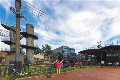 12月下旬,798藝術(shù)區(qū)內(nèi)游人不多,一些游客在798創(chuàng)意廣場(chǎng)30米長(zhǎng)的涂鴉墻前拍照,工廠時(shí)期的輪碾機(jī)被做成路標(biāo)、石臺(tái),隨處可見(jiàn)。銹跡斑斑的機(jī)器、鋼管鐵道、高高的煙囪與先鋒藝術(shù)雕塑和畫作共生,游客們穿梭于傳統(tǒng)工業(yè)與現(xiàn)代藝術(shù)之間。