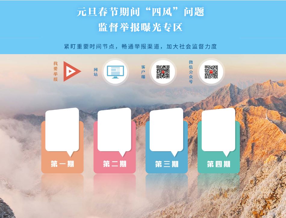 2019年元旦、春節(jié)將至,為切實(shí)抓好節(jié)日期間落實(shí)中央八項(xiàng)規(guī)定及其實(shí)施細(xì)則精神、糾正“四風(fēng)”工作,營造風(fēng)清氣正節(jié)日氛圍,中央紀(jì)委國家監(jiān)委網(wǎng)站推出“元旦春節(jié)期間‘四風(fēng)’問題監(jiān)督舉報(bào)曝光專區(qū)”,暢通監(jiān)督舉報(bào)渠道,加大典型案例通報(bào)曝光力度,增強(qiáng)警示震懾和教育引導(dǎo)作用。