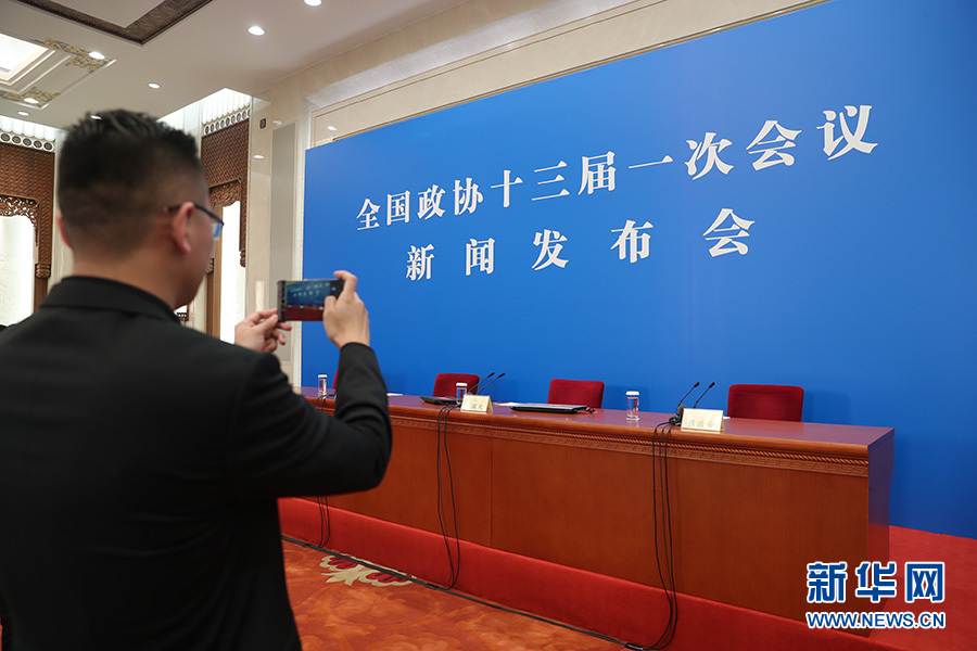 全國(guó)政協(xié)十三屆一次會(huì)議新聞發(fā)布會(huì)3月2日16:30在人民大會(huì)堂一層新聞發(fā)布廳召開,大會(huì)新聞發(fā)言人王國(guó)慶向中外媒體介紹本次大會(huì)有關(guān)情況并回答記者提問(wèn)。圖為發(fā)布會(huì)前記者在現(xiàn)場(chǎng)拍攝。新華網(wǎng)/中國(guó)政府網(wǎng) 翟子赫攝