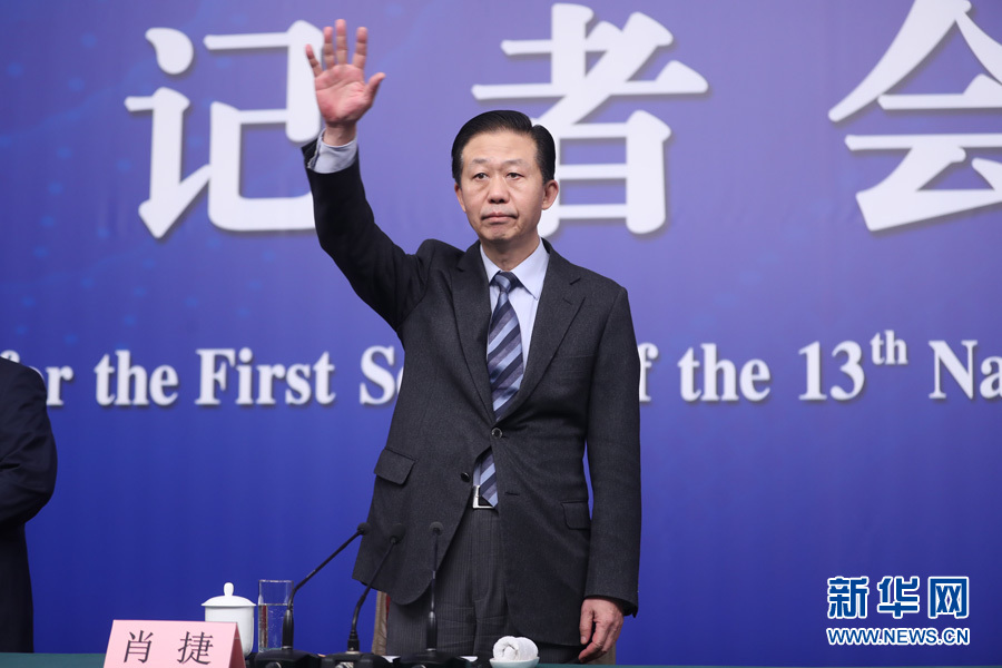十三屆全國人大一次會議新聞中心于3月7日上午在梅地亞中心多功能廳舉行記者會,邀請財(cái)政部部長肖捷,副部長史耀斌、胡靜林就“財(cái)稅改革和財(cái)政工作”相關(guān)問題回答中外記者提問。圖為財(cái)政部部長肖捷向記者舉手示意。新華網(wǎng)/中國政府網(wǎng)?翟子赫 攝