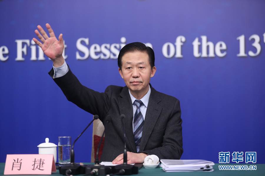 十三屆全國人大一次會議新聞中心于3月7日上午在梅地亞中心多功能廳舉行記者會,邀請財(cái)政部部長肖捷,副部長史耀斌、胡靜林就“財(cái)稅改革和財(cái)政工作”相關(guān)問題回答中外記者提問。圖為財(cái)政部部長肖捷向記者舉手示意。新華網(wǎng)/中國政府網(wǎng) 翟子赫 攝