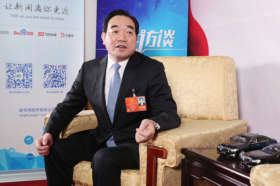 3月20日,全國(guó)人大代表、江蘇省徐州市市長(zhǎng)周鐵根做客新華網(wǎng)人民大會(huì)堂兩會(huì)特別訪(fǎng)談間。新華網(wǎng) 郝廣鵬 攝