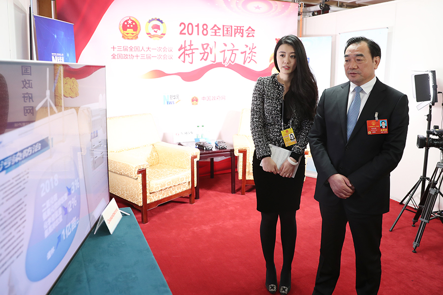 3月20日,全國(guó)人大代表、江蘇省徐州市市長(zhǎng)周鐵根在新華網(wǎng)人民大會(huì)堂兩會(huì)特別訪(fǎng)談間內(nèi)觀看新華網(wǎng)創(chuàng)意視頻產(chǎn)品《躍然紙上看報(bào)告》。新華網(wǎng) 郝廣鵬 攝