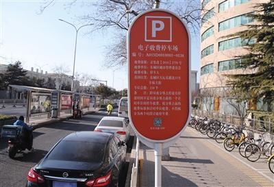 昨日,東城區(qū)體育館路附近,一處道路停車電子收費停車場已換上橙色的新版收費提示牌。