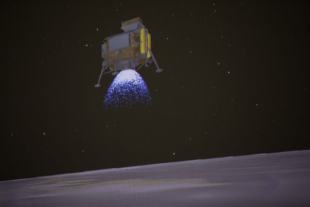 圖為1月3日在北京航天飛行控制中心拍攝的降落過程(示意圖)。1月3日10時26分,嫦娥四號探測器自主著陸在月球背面南極-艾特肯盆地內(nèi)的馮·卡門撞擊坑內(nèi),實現(xiàn)人類探測器首次在月球背面軟著陸。新華社記者 金立旺 攝