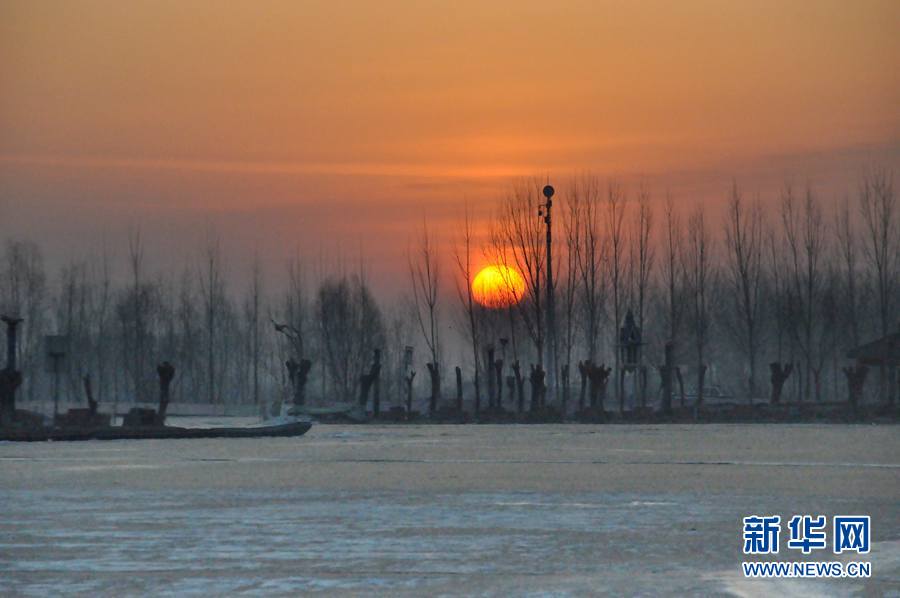 1月16日,白洋淀上朝陽正冉冉升起。新華網(wǎng)發(fā)(馬曉 攝)
