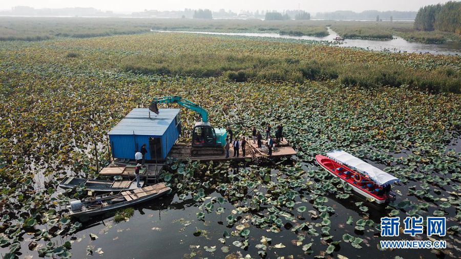 安新縣水產(chǎn)養(yǎng)殖戶在白洋淀清除漁場設(shè)施(2018年10月5日攝)。新華網(wǎng)發(fā)(張斌 攝)