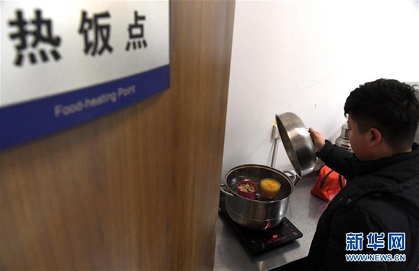 1月22日,李翔在新鄉(xiāng)東站熱飯點(diǎn)為妻子加熱晚餐。新華社記者 李安 攝