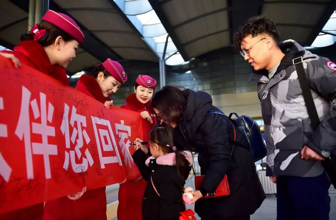 2019-02-03,天津西站。開車前,旅客與列車乘務人員在天津西站站臺上共同寫下新年祝福。作者:三木