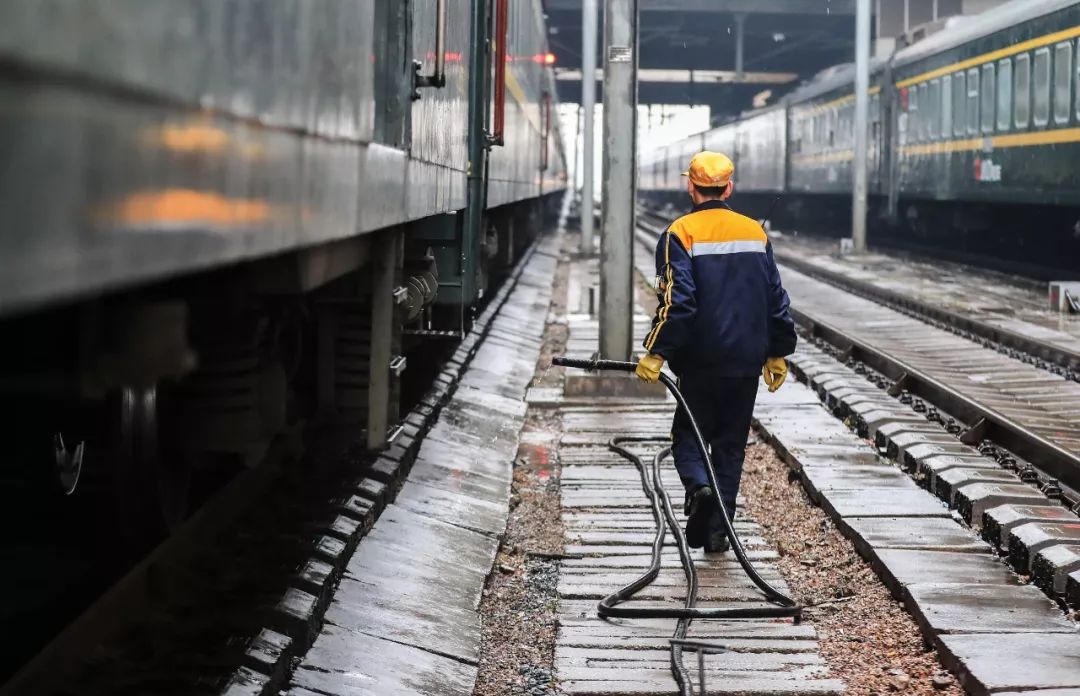 2019-01-11,天津。天津客運段刷車工正在對車體進行全面沖刷。作者:三生石