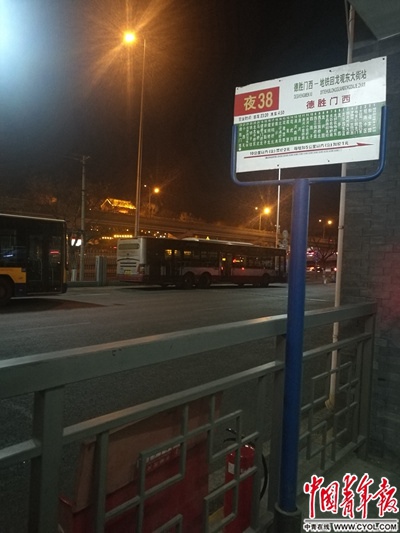 夜38路公車站牌。? 張渺/攝