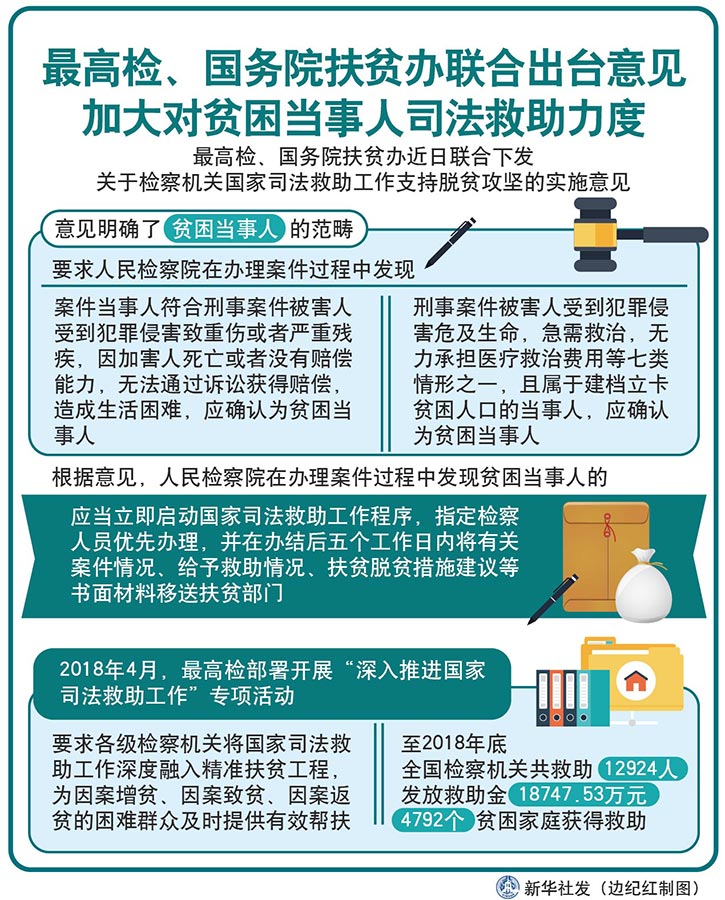 圖表:最高檢、國(guó)務(wù)院扶貧辦聯(lián)合出臺(tái)意見(jiàn) 加大對(duì)貧困當(dāng)事人司法救助力度 新華社發(fā) 邊紀(jì)紅 制圖
