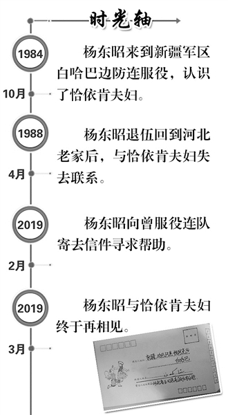 2月23日,新疆軍區(qū)某邊防團(tuán)白哈巴邊防連收到了一封老兵來(lái)信——退伍31年的楊東昭,懇請(qǐng)連隊(duì)幫助尋找駐地哈薩克族老鄉(xiāng)恰依肯·米哈提夫婦,并在信封里附上一封特殊的“家書(shū)”。