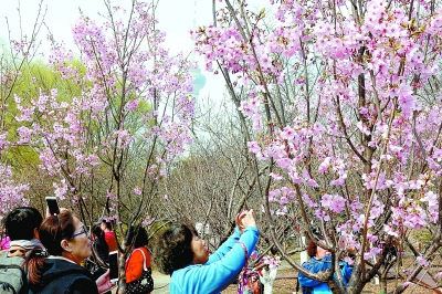 玉淵潭公園的杭州早櫻綻放枝頭,游客紛紛拍照留念。北京日?qǐng)?bào)記者 吳鏑攝