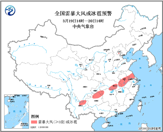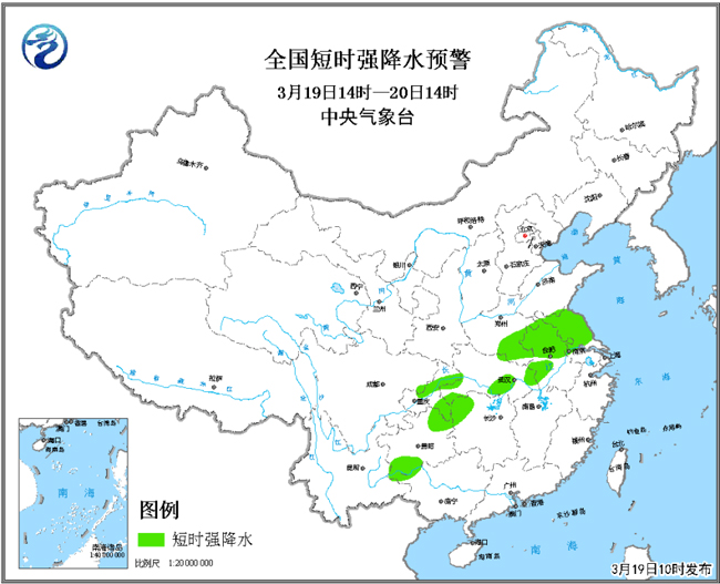 這次降雨過程中,會(huì)有明顯的雷電天氣。從19日夜間開始,河南南部、江蘇、安徽東北部、湖北北部、湖南西北部和貴州北部等地將先后出現(xiàn)雷電、短時(shí)強(qiáng)降水、雷暴大風(fēng)和冰雹等強(qiáng)對(duì)流天氣。19日10時(shí),中央氣象臺(tái)發(fā)布了強(qiáng)對(duì)流天氣藍(lán)色預(yù)警。