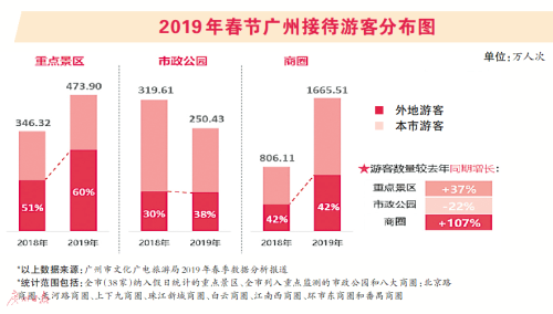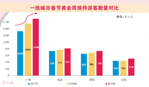 2019年春節(jié),廣州創(chuàng)下游客接待量和旅游業(yè)總收入“雙新高”,共接待旅客1696.27萬人次,較2018年同期增長8.66%,高于北京的811.70萬人次、上海的509.20萬人次,居一線城市首位,分別是北京的兩倍和上海的三倍;旅游業(yè)創(chuàng)收122億元,實(shí)現(xiàn)9.74%的增長,高于北京的81.85億元和上海的66.20億元,分別是北京的1.5倍和上海的1.8倍。
