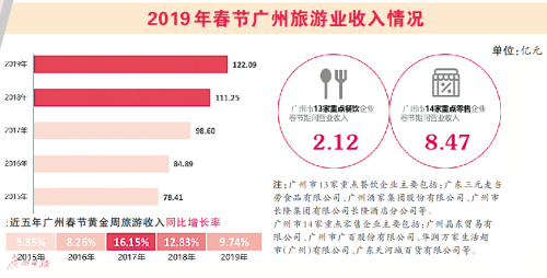 自2015年以來,廣州春節(jié)黃金周旅游總收入逐年攀升。2018年突破百億大關(guān),今年再創(chuàng)新高。大批旅客的到來帶動廣州與旅游相關(guān)的餐飲、零售等行業(yè)的持續(xù)旺盛。