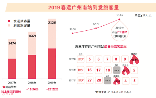 2019年春運(yùn)期間(1月21日至3月1日),廣州南站到發(fā)旅客2126.37萬人次,日均旅客到發(fā)量53萬人次,同比增長24.23%,居全國第一。另外,今年廣州到達(dá)旅客量達(dá)1050.75萬人次,較上年同期增長27.22%,創(chuàng)近三年來最大增幅,春運(yùn)期間來廣州的旅客數(shù)不斷攀升。廣州南站客流峰值出現(xiàn)在2月10日(年初六),到發(fā)客流量達(dá)67.14萬人次,較去年春運(yùn)峰值(55.72萬人次)上升20.49%。