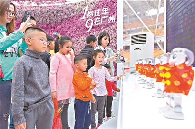 海心沙AI花市現(xiàn)場,小朋友聚精會神地看著機(jī)器人跳舞。廣州日報(bào)全媒體攝影記者 蘇俊杰 攝