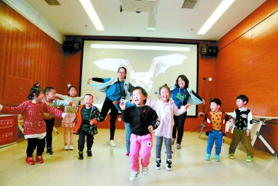 在通州區(qū)圖書(shū)館,孩子們跟著“故事人”模仿蝙蝠飛行。