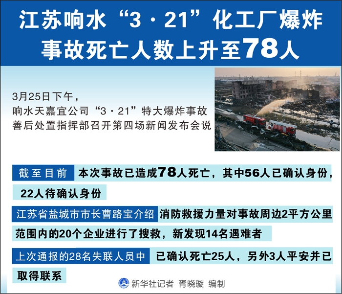 新華社響水3月25日電(記者朱國亮)25日下午,響水天嘉宜公司“3·21”特大爆炸事故善后處置指揮部召開第四場新聞發(fā)布會說,截至目前,本次事故死亡人數(shù)上升至78人。