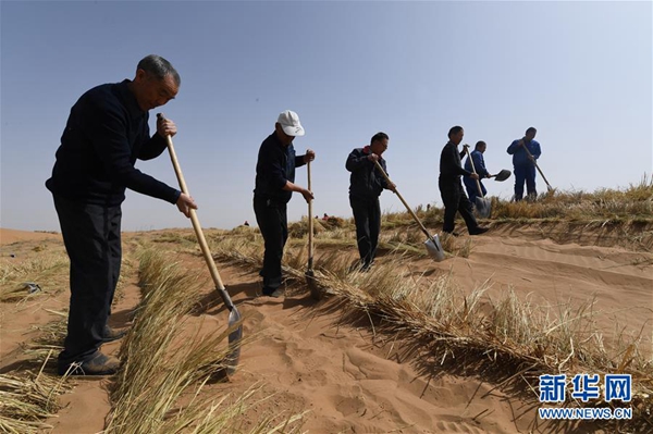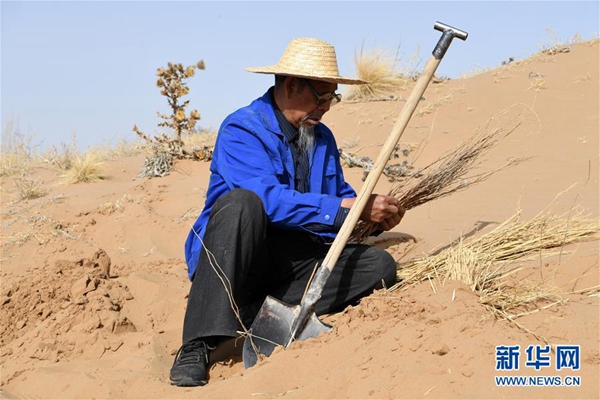 在甘肅省古浪縣境內(nèi)的黑崗沙風(fēng)沙口,八步沙第二代治沙人用稻草壓沙(3月26日攝)。新華社記者 范培珅 攝
