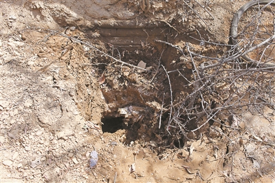 2015年一場(chǎng)降雨過(guò)后,寶頂旁的泥土出現(xiàn)沉降,露出一個(gè)回填不實(shí)的盜洞