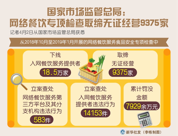 新華社北京4月2日電(記者趙文君)記者2日從國家市場監(jiān)管總局獲悉,在近期開展的網(wǎng)絡餐飲服務食品安全專項檢查中,下線入網(wǎng)餐飲服務提供者18.5萬家,取締無證經(jīng)營9375家。