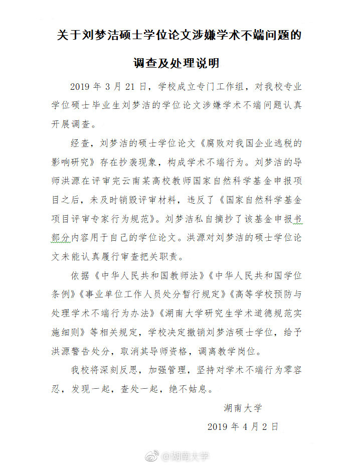 近日,云南財(cái)經(jīng)大學(xué)一名教師舉報(bào),湖南大學(xué)劉夢(mèng)潔碩士論文涉嫌剽竊有保密規(guī)定的國(guó)家自然科學(xué)基金項(xiàng)目申請(qǐng)書。湖南大學(xué)官方微博2日發(fā)布消息稱,劉夢(mèng)潔的碩士學(xué)位論文存在抄襲現(xiàn)象,構(gòu)成學(xué)術(shù)不端行為。學(xué)校決定撤銷劉夢(mèng)潔碩士學(xué)位,給予其導(dǎo)師洪源警告處分,取消其導(dǎo)師資格,調(diào)離教學(xué)崗位。