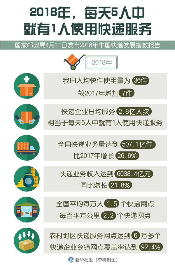 新華網(wǎng)北京4月12日電(記者 李志強(qiáng))11日,國家郵政局發(fā)布《2018年中國快遞發(fā)展指數(shù)報(bào)告》(以下簡稱《報(bào)告》)。《報(bào)告》顯示,2018年,中國快遞業(yè)務(wù)量超過美、日、歐發(fā)達(dá)經(jīng)濟(jì)體之和,規(guī)模連續(xù)五年穩(wěn)居世界第一,成為全球快遞包裹市場發(fā)展的動(dòng)力源和穩(wěn)定器。