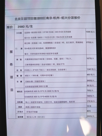 海淀區(qū)某中學則向家長公開了收費明細。在家長王先生提供的游學清單上,記者看到5天的研學旅行費用為3980元,游覽地點包括南京大屠殺遇難同胞紀念館、西湖和魯迅紀念館等。行程中還設(shè)置了眾多教育內(nèi)容,比如參加南京大學講座、著漢服行謝師禮、探究杭州西湖的光學現(xiàn)象等。