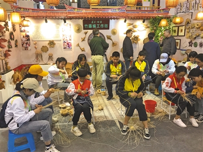 學(xué)生藝術(shù)實(shí)踐工作坊,來自福建安溪的小學(xué)生展示竹藤編。新京報(bào)記者 馮琪 攝